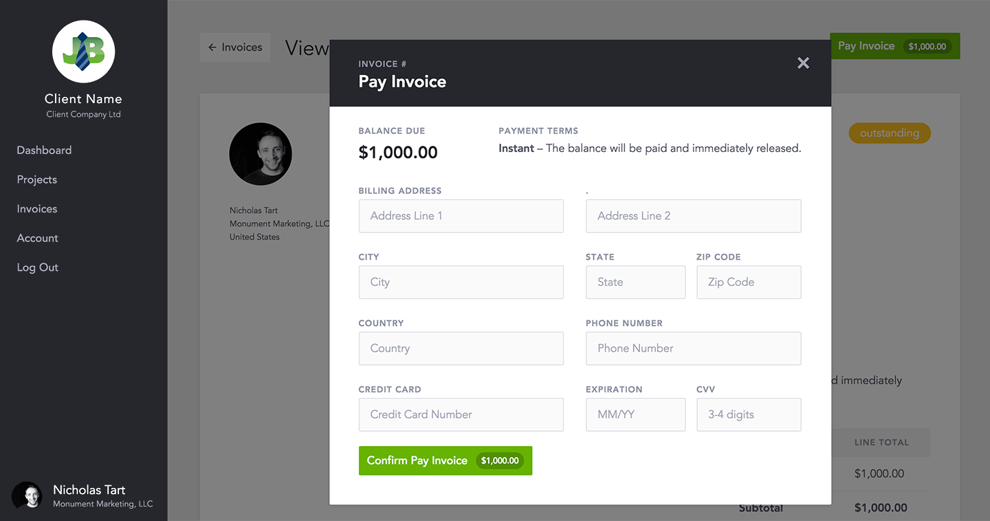 - Client Control - Where clients log in, view projects, and pay invoices.