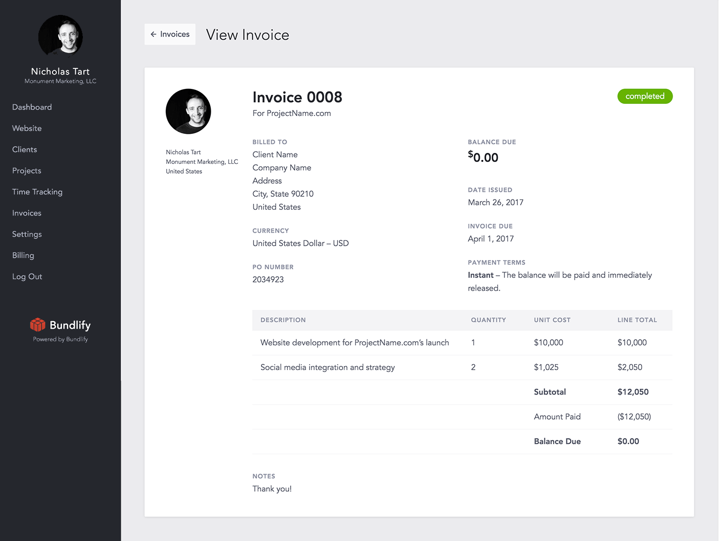 Each item—client, project, invoice, etc.—needed a view panel. This was the layout for an invoice with the status in the upper right.